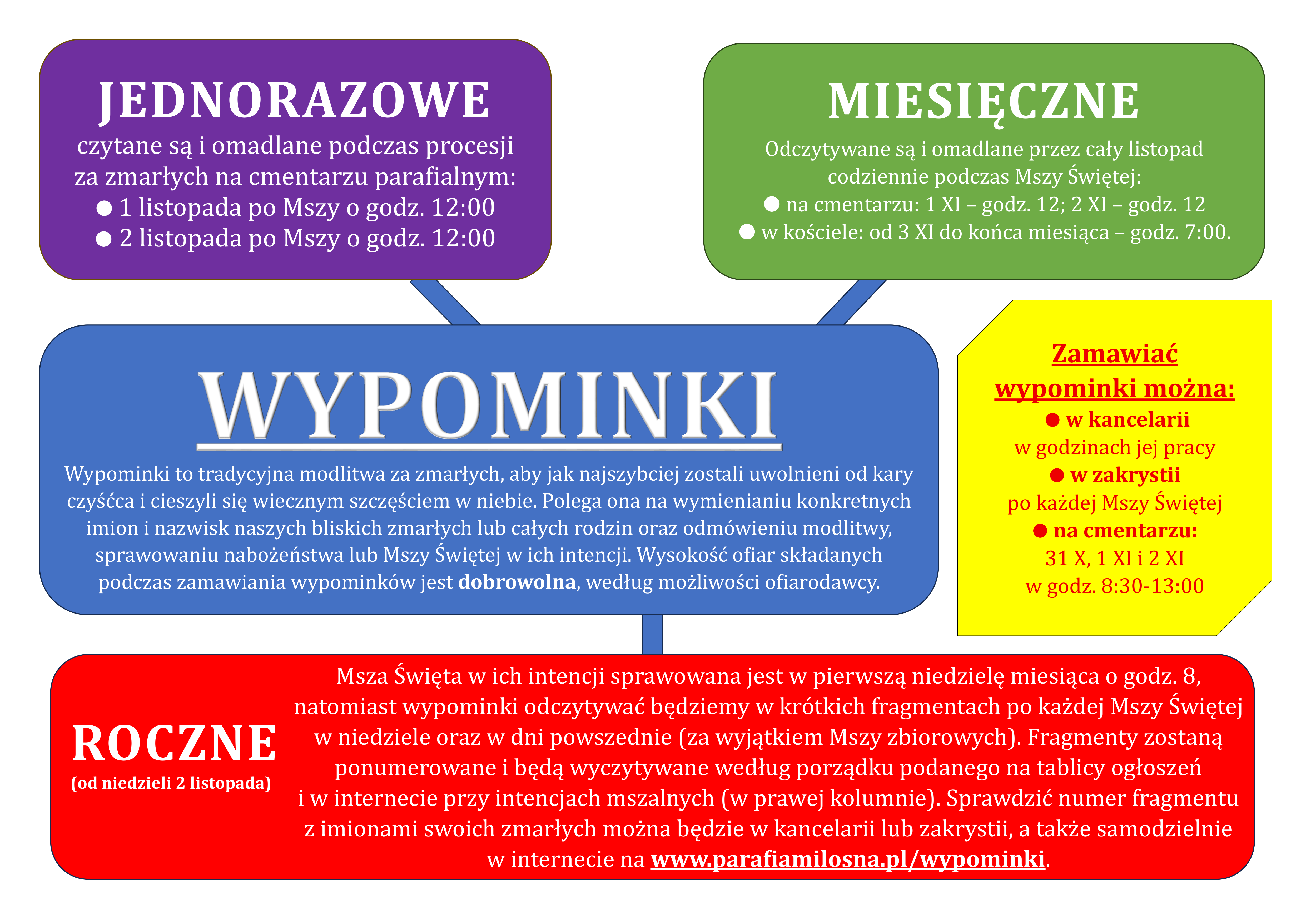 - Wypominki miesięczne czytane są i omadlane przez cały listopad podczas Mszy o godz. 7 (za wyjątkiem 1 listopada – godz. 12; 2 listopada – godz. 12)